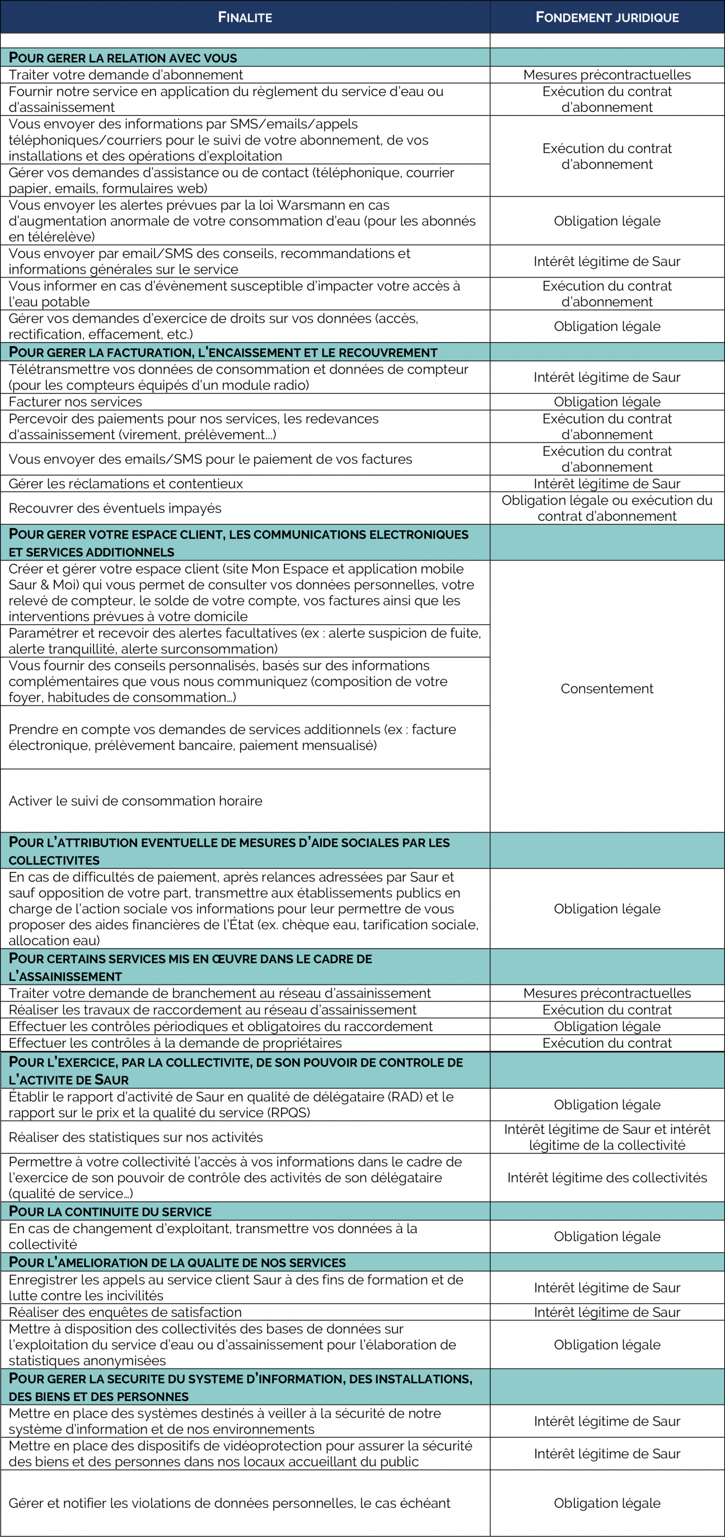 Saur recueille vos données personnelles soit directement auprès de vous, soit auprès des collectivités (commune, syndicat ou communauté de communes), lorsqu’elles confient à Saur l’exploitation d’une nouvelle concession de service public.